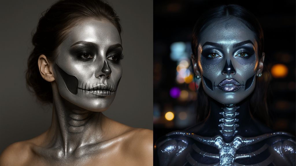 10. 💎 Crystal Skull — Glam Meets Graveyard If the Golden Skull was warm and opulent, the Crystal Skull is its cool-toned, futuristic cousin. This look is pure, sparkling extravagance. It’s less "bone" and more "bejeweled artifact," using metallic greys and hundreds of rhinestones for a blinding, high-glam finish.